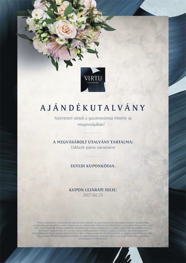 Emelje az ajándékozás élményét új szintre a VIRTU Restaurant exkluzív ajándékutalványával, amelyet mostantól személyre szabott üzenettel is különlegessé tehet. Válassza ki az Önnek leginkább tetsző dizájnt, adjon hozzá egy szívhez szóló üzenetet, és lepje meg szeretteit egy felejthetetlen gasztronómiai élménnyel!